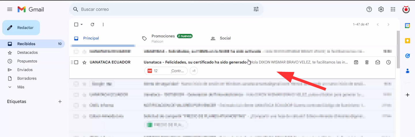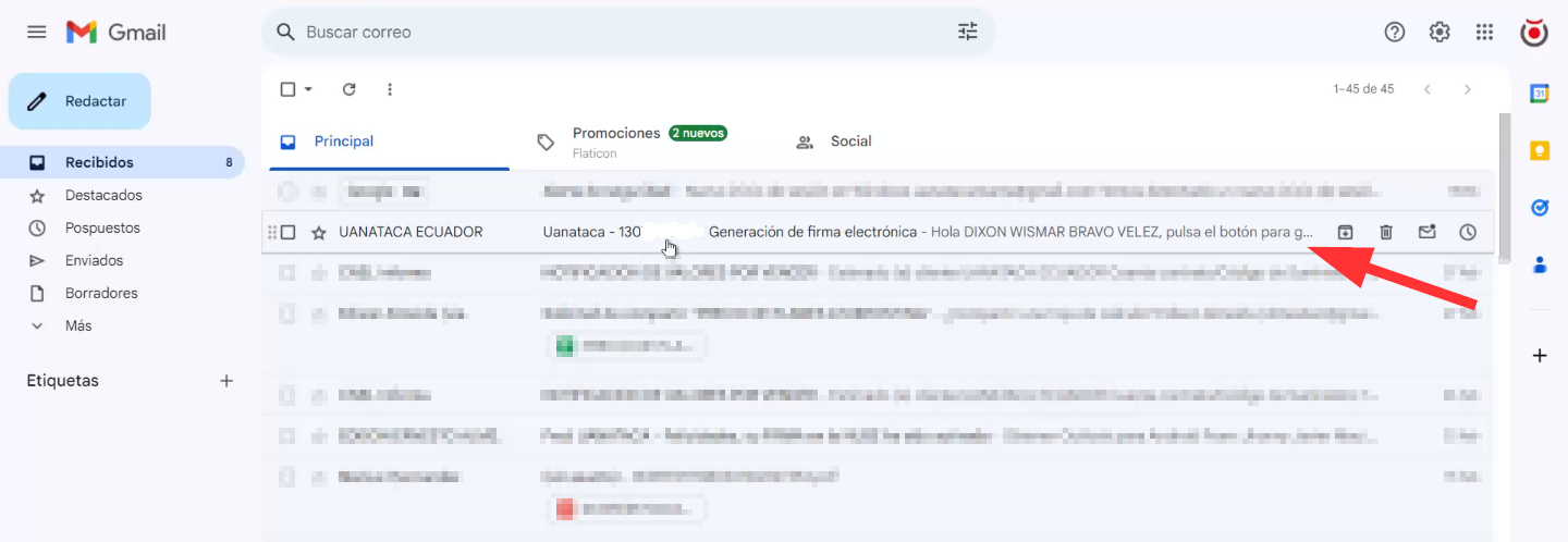Después de que su firma haya sido aprobada, recibirá un correo electrónico del remitente Uanataca Ecuador. Si no encuentra este correo en la bandeja de entrada, revise la carpeta de spam o correo no deseado. Deberá moverlo a la bandeja principal para evitar su eliminación automática.