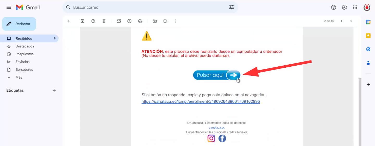 Una vez que haya localizado el correo, ábralo y haga clic en el botón “Pulsar aquí”.