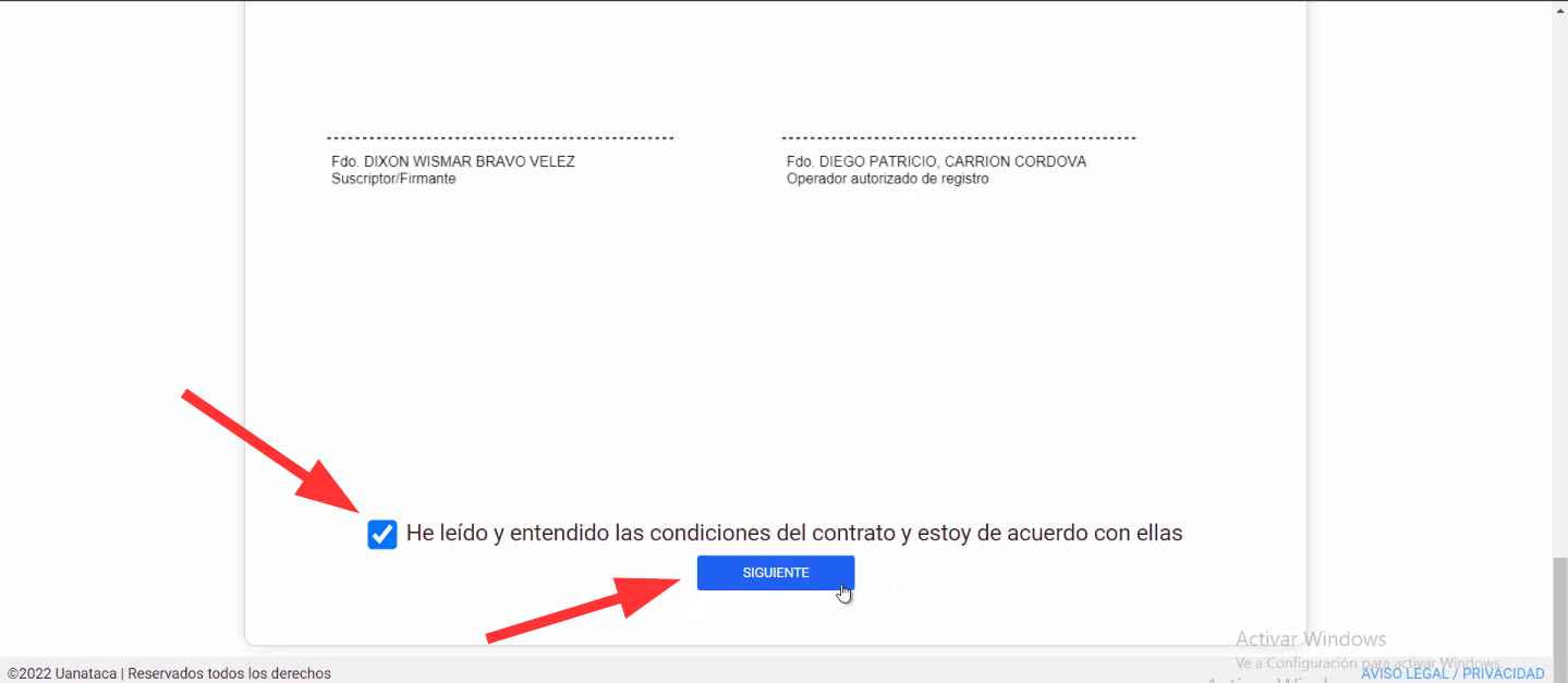 Al final de la página, encontrará la casilla que debe marcar para aceptar los términos y condiciones del contrato de prestación de servicios de certificación. Una vez marcada, haga clic en el botón "Siguiente".