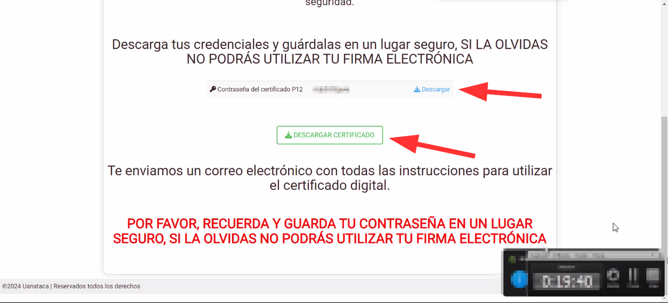 Luego, descargue su certificado de firma digital haciendo clic en el botón verde "Descargar Certificado".