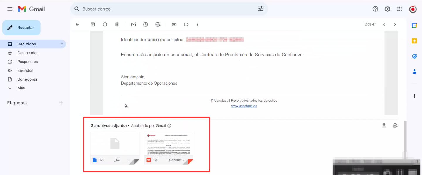 Después de generar su firma electrónica, recibirá otro correo electrónico de Uanataca Ecuador con una copia firmada del Contrato de Prestación de Servicios y su archivo de certificado de firma digital.