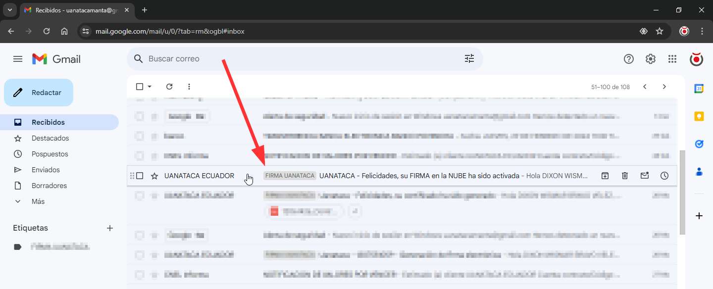 1. Abre el correo del remitente Uanataca Ecuador con el asunto “UANATACA - Felicidades, su FIRMA en la NUBE ha sido activada”.
