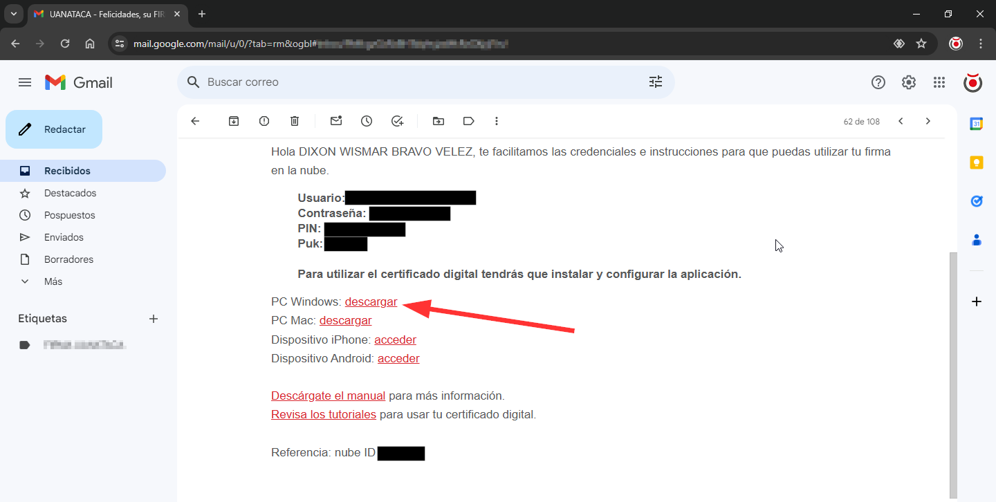 2. Dentro de este correo encontrarás el enlace para descargar la aplicación “SignCloudPC.exe” para tu PC Windows o MAC. Además, se mostrarán las credenciales e instrucciones para que puedas utilizar tu firma en la nube.