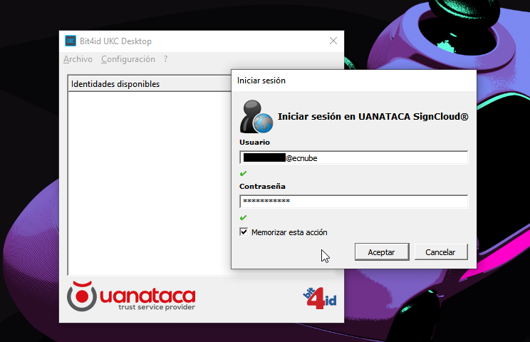 3. En la ventana emergente, deberás ingresar tu usuario y contraseña asociados a tu certificado digital. Estas credenciales están en el correo de activación de la firma en la nube del remitente Uanataca Ecuador.