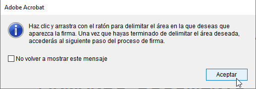 Se te mostrara el siguiente mensaje indicando que deberás hacer clic y arrastrar el ratón para delimitar el área en la que desea que aparezca la firma.
