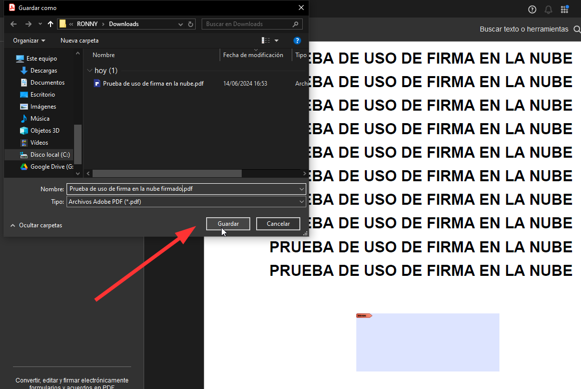 8. Elige la carpeta donde guardar el PDF firmado y haz clic en “Guardar”.