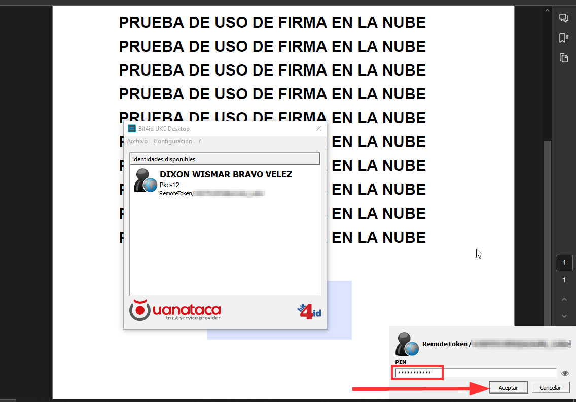 9. Se te solicitará ingresar la contraseña de tu certificado, la cual deberás ingresar en la ventana de UKC en la parte inferior derecha. Posteriormente, haz clic en "Aceptar".